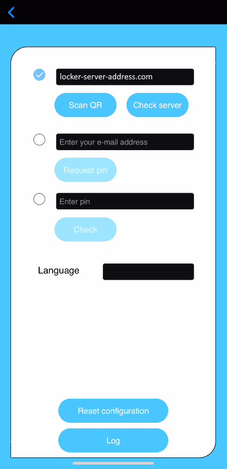 First connect and authenticate with correct server. The connection string to the locker system is provided by your locker owner. Use the 'Scan QR' button to get this info from a provided QR code.